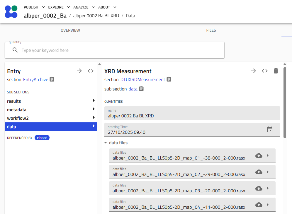 This guide explains how to add X-ray Diffraction (XRD) structural characterization data to your combinatorial library in NOMAD Oasis.