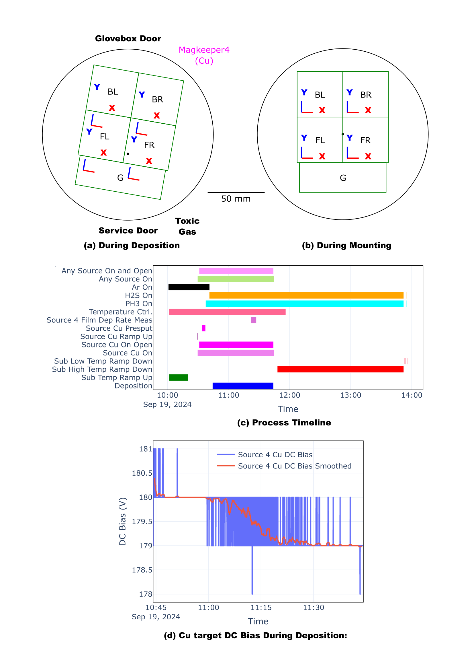 Default graphs obtained from parsing a log file through the sputtering entry. (a) Position of the different substrates on the platen during deposition, relative to the sources, namely the reactive toxic gas inlet (H2S + PH3) and the Cu target and other sputtering chamber landmark. (b) Position of the substrate during mounting, defining the orientation of base coordinate system for the combinatorial library. (c) Process timeline graph representing the extent in time of different process-relevant events, such as the moments where reactive gases were flown in the chamber (PH3 On, H2S on) or the moment of the deposition itself. (d) The DC self-bias developed by the Cu target during the deposition.
